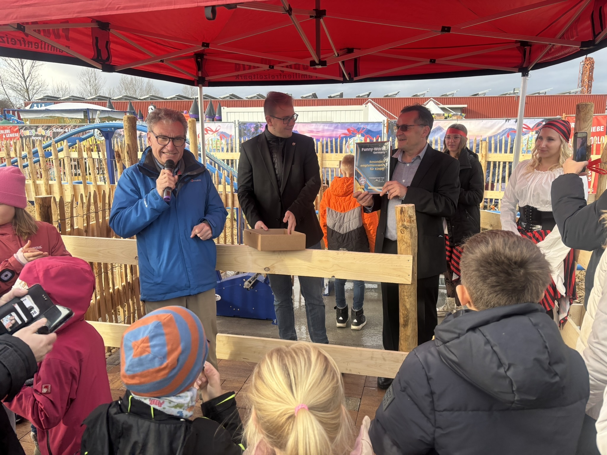 In Anwesenheit der geladenen Gäste, übergab Alfons Spirig (Präsident) des Freizeitpark-Tester Team mit Sitz in der Schweiz die Erneuerungsurkunde „Besonders empfehlenswert für Kinder“ an Michael Schludecker. „Das Funny World setzt seit beginn konsequent auf das Erlebnis mit Kindern, so sind alle Attraktionen im Grundsatz, dass immer eine Zweitperson, das Fahrgeschäft startet oder mit Körpereinsatz dazu beitragen muss, dass die Attraktion in Bewegung kommt. Es ist nur gemeinsam möglich das Abenteuer Funny World zu erleben und das ist hier Einzigartig“, so Spirig. Der FTT besucht das Funny World seit über 20 Jahren und sieht die stetige Weiterentwicklung in dem Bereich Fahrgeschäften und Theming. „Wir können das Funny World uneingeschränkt für Kinder bis sicher 12 Jahren besonders Empfehlen“.
